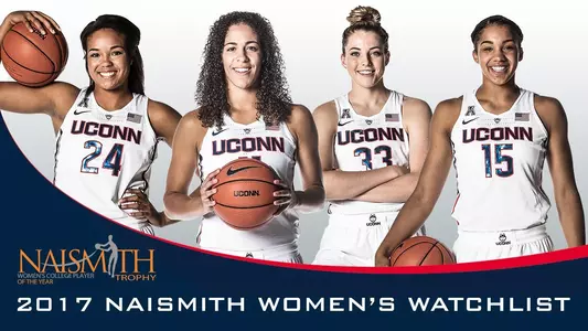 The Huskies are undefeated 5-0 to start the season after they extended their second-longest winning streak in program history to 80 games, defeating Chattanooga 80-43 Tuesday. Four Huskies were named to the 2017 Naismith Trophy Watch List Wednesday morning as announced by the Atlanta Tipoff Club. Juniors Kia Nurse (Hamilton, Ont.) and Gabby Williams (Sparks, Nev.) and sophomores Napheesa Collier (O'Fallon, Mo.) and Katie Lou Samuelson (Huntington Beach, Calif.) each claimed a spot on the watch list comprised of 50 student-athletes and were the only players representing the American Athletic Conference.