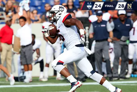ANNAPOLIS, Md. - A furious, late drive by the UConn football team ended on the half-yard line as time expired on Saturday afternoon as Navy survived a second-half comeback attempt by the Huskies and posted a 28-24 win before a crowd of 31,501 at Navy-Marine Corps Memorial Stadium. The loss drops UConn to 1-1 on the season and 0-1 in American Athletic Conference play while the Midshipmen are 2-0 and 1-0.