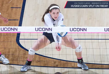 BATON ROUGE, La. - The University of Connecticut volleyball team earned a split in Friday's doubleheader, beating LSU in the morning and falling to Southern Miss in the evening, on the first day of the Tiger Classic in the Maravich Center.