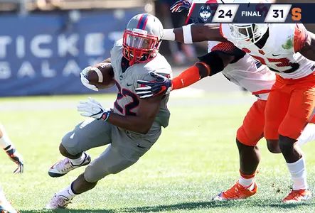 The Huskies had a chance to tie the game in the fourth quarter after holder redshirt Tyler Davis (Bellmore, N.Y.), out of the holder position, hit redshirt junior tight end Tommy Myers (Coventry, Conn.) with a 17-yard pass on a fake field goal to set the Huskies up at the Syracuse eight-yard line with seven minutes to go. Syracuse's defense held and the Orange marched the length of the field to put the game away with a six-yard TD run by quarterback Eric Dungey to make it 31-17 Syracuse with 2:14 to play.