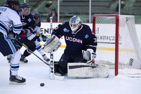BOSTON, Mass. - The UConn men's hockey team fired 31 shots on Maine Rob McGovern and the sophomore goaltender stopped every one as the Huskies were shutout 4-0 Saturday afternoon at the 2017 Capitol One Frozen Fenway at Boston's historic Fenway Park.