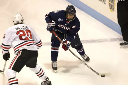 UConn threatened a comeback with an early strike in the third as Kalter gathered a loose puck in the neutral zone and skated in on Hernberg along for a shorthanded goal at 2:40, cutting the deficit to 4-2.