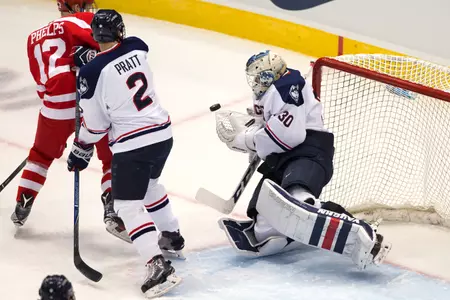 UConn held a 12-3 shot advantage in the third and came up empty on their lone power play chance. The Huskies pulled Huska with 2:07 left to play and kept the River Hawks hemmed in the zone for much of the final two minutes. UConn peppered Herberg in the closing minutes but could not find the equalizer.