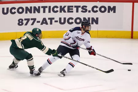 HARTFORD, Conn. - The UConn men's hockey team held a 2-0 lead into the second period but Vermont would rattle off four unanswered goals on the way to a 4-2 Hockey East win Saturday afternoon from the XL Center to split the weekend conference series. The Huskies are now 3-6-1 overall and 2-3-1 in the HEA while UVM improves to 3-5-1 and 1-1-1 in the league.