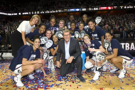 Players from Auriemma's first team in 1985 that beat Iona for win No. 1 were in attendance and introduced to the sellout crowd. His current team held up masks of Auriemma and Dailey with their pictures from 1985. Fans held up signs they were given that said ''GEN1000 career wins.''