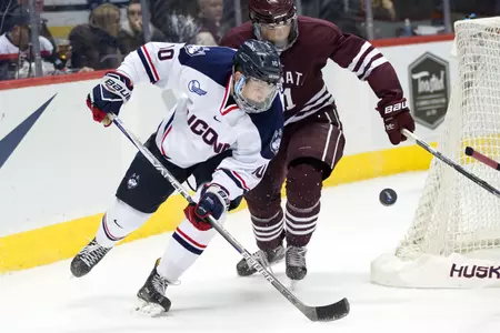 The two teams skated to a scoreless second period with UConn coming up empty on a pair of power play chances. The Huskies went to the power play at 9:47 on a cross-checking call and then drew a second penalty on a break-away chance to set-up a 5-on-3 for 52 seconds.