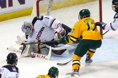 UConn senior Tanner Creel (Arlington Heights, Ill.) got the start in goal, his third of the season, for an injured Adam Huska (Zvolen, Slovakia). Creel made 27 saves in taking the loss, but kept the Friars off the scoreboard in the second and third periods.