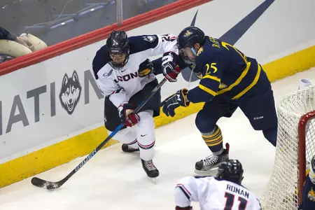 UConn got just 21 shots on goal, their fourth lowest total of the season. QU also killed off all six UConn power play chances, including a 5-on-3 to start the third period. UConn netminder Adam Huska (Zvolen, Slovakia) made 24 saves in taking the loss.