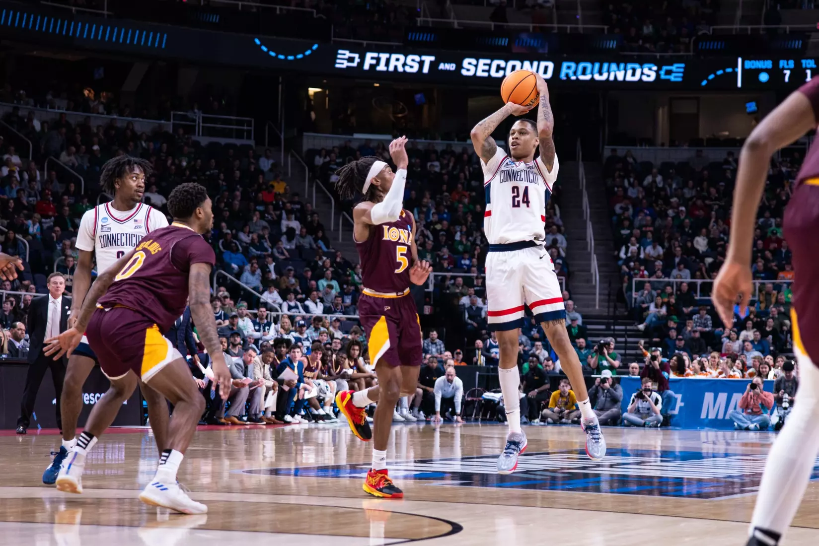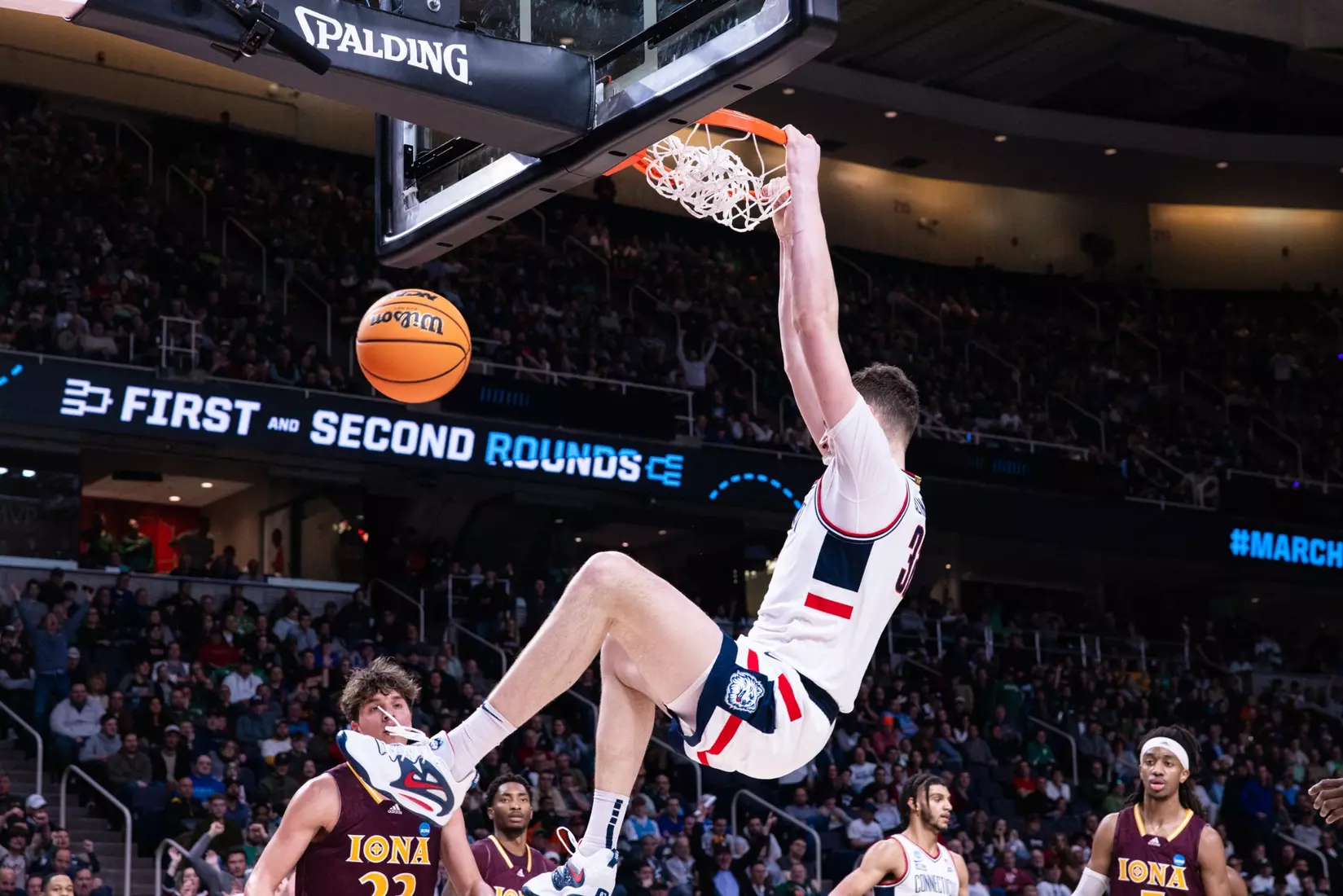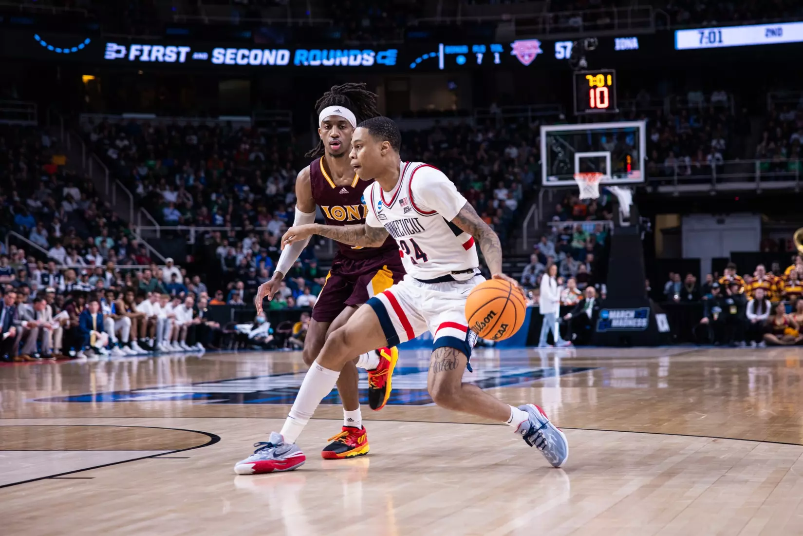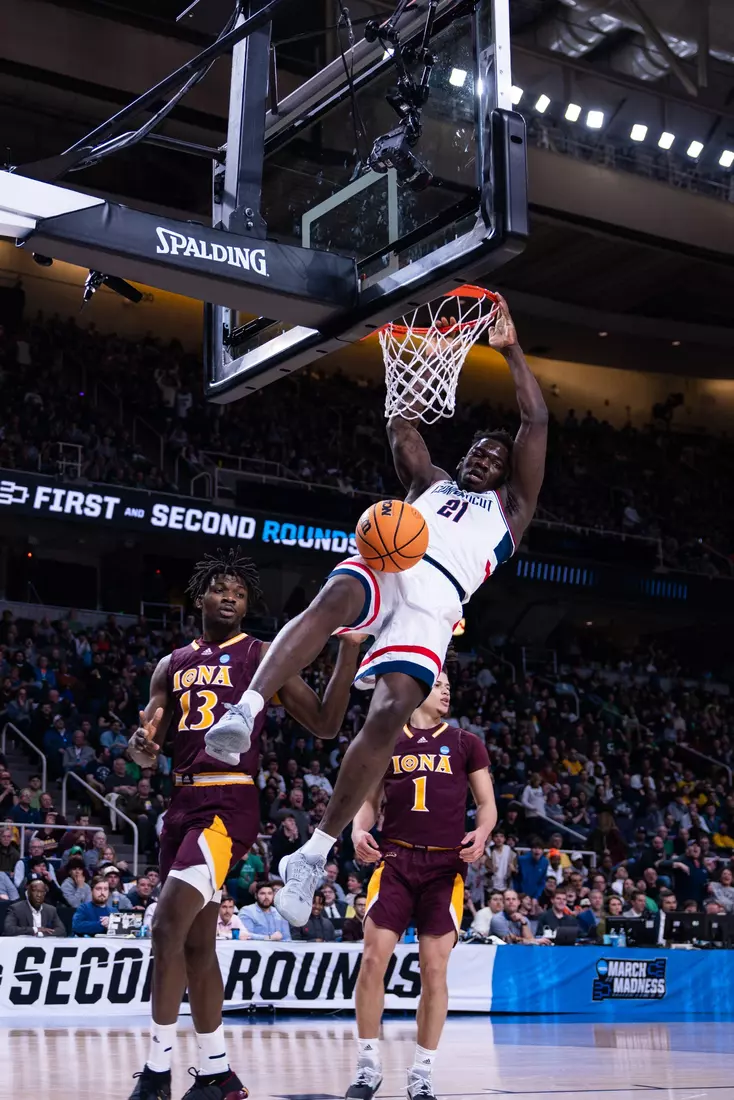 ALBANY, N.Y. (AP) — Adama Sanogo scored 10 of his 28 points in the first five minutes of the second half as fourth-seeded UConn took control and beat Rick Pitino's Iona Gaels 87-63 Friday in the first round of the NCAA Tournament.