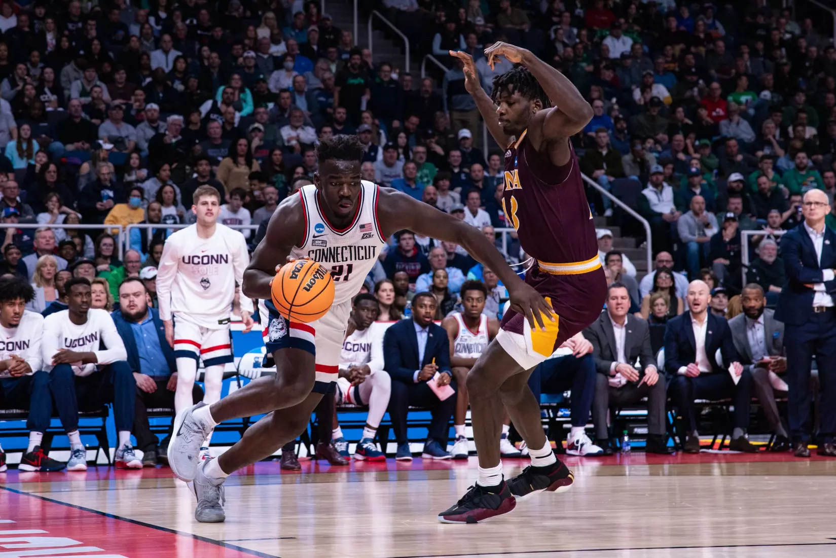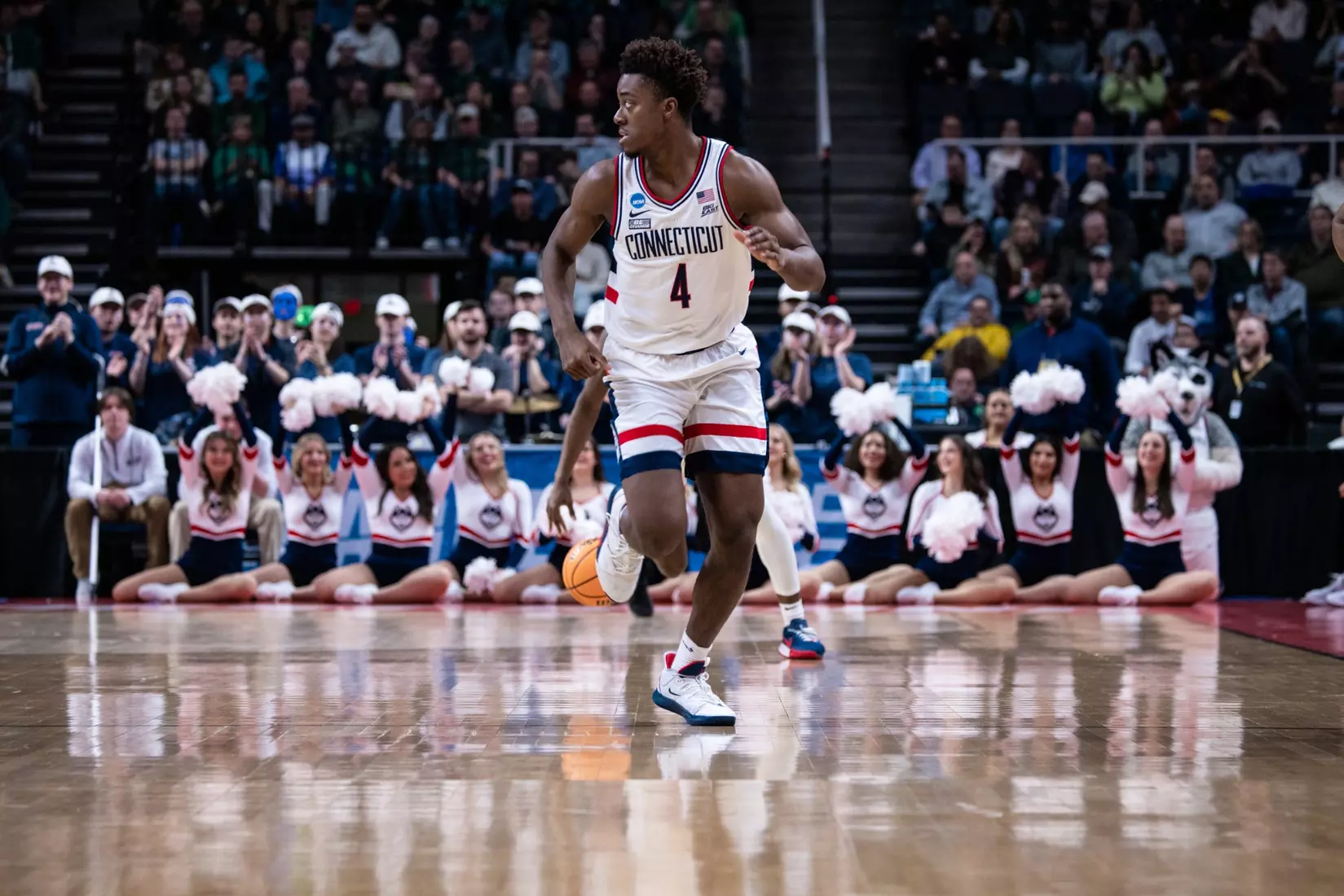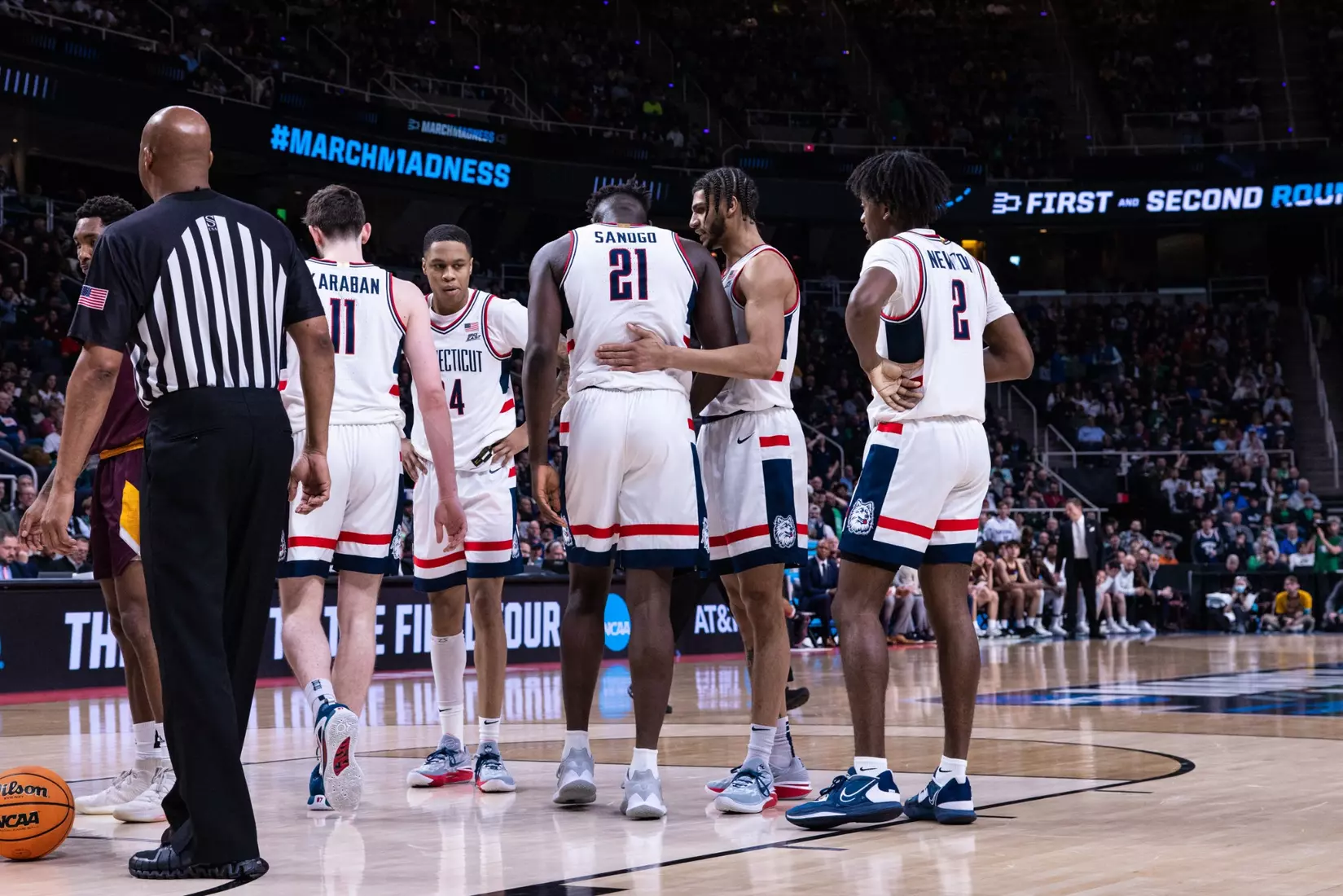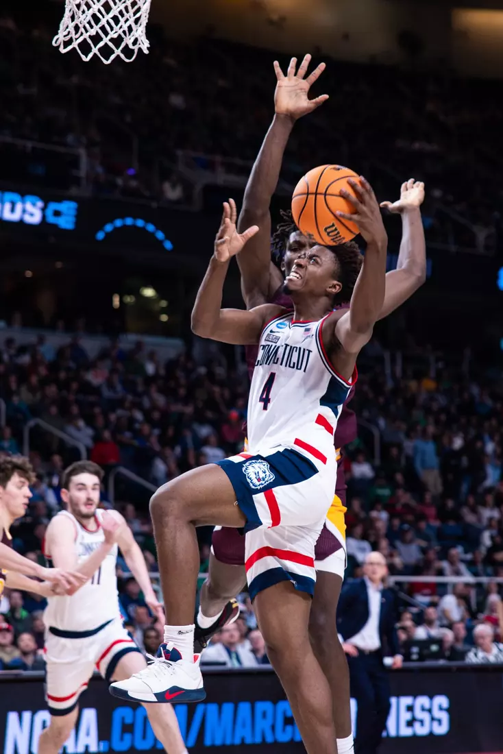 UConn trailed by a point at half, but came out of the break clicking. A four-point play by Jordan Hawkins immediately gave the Huskies the lead and then Sanogo went to work inside.
