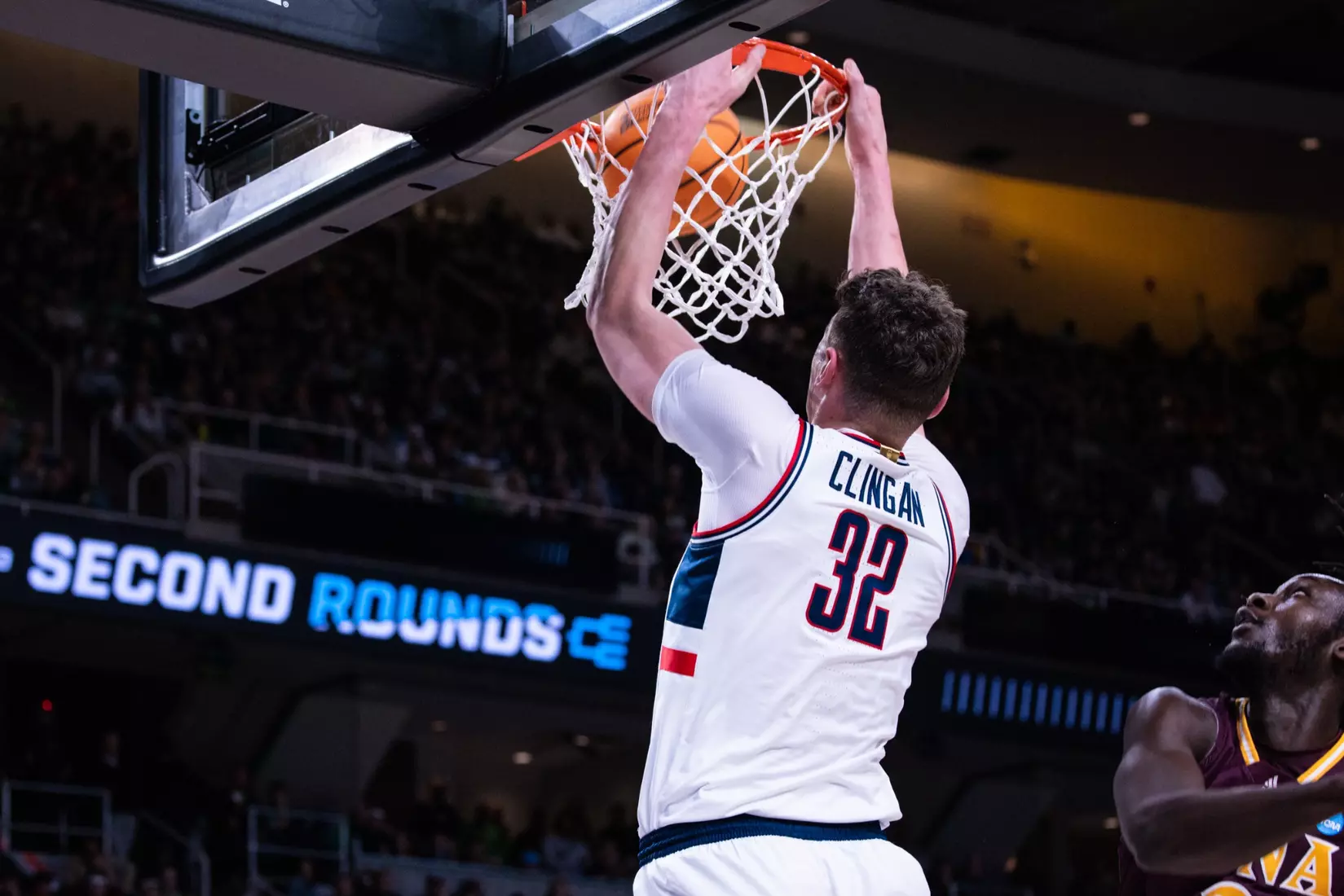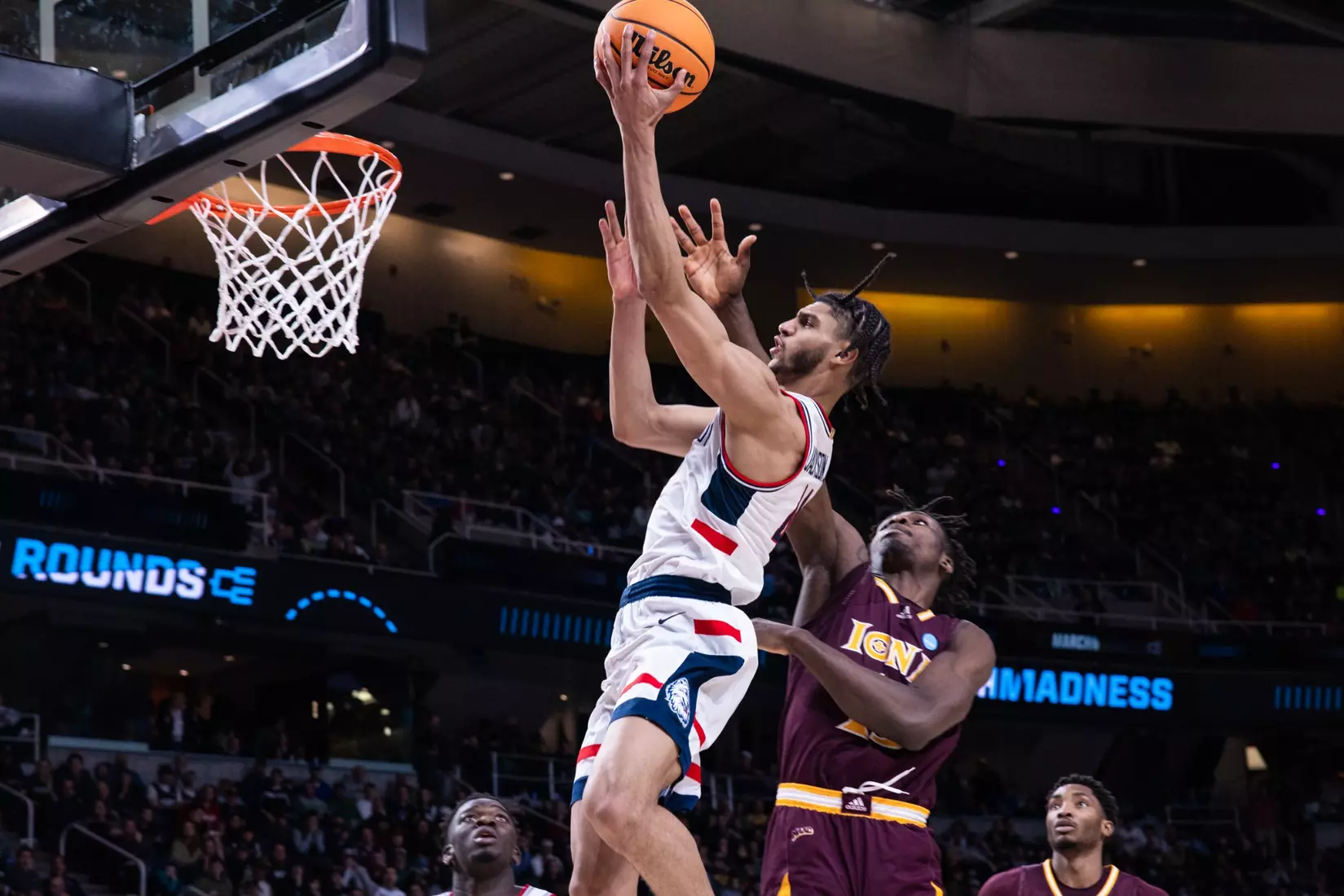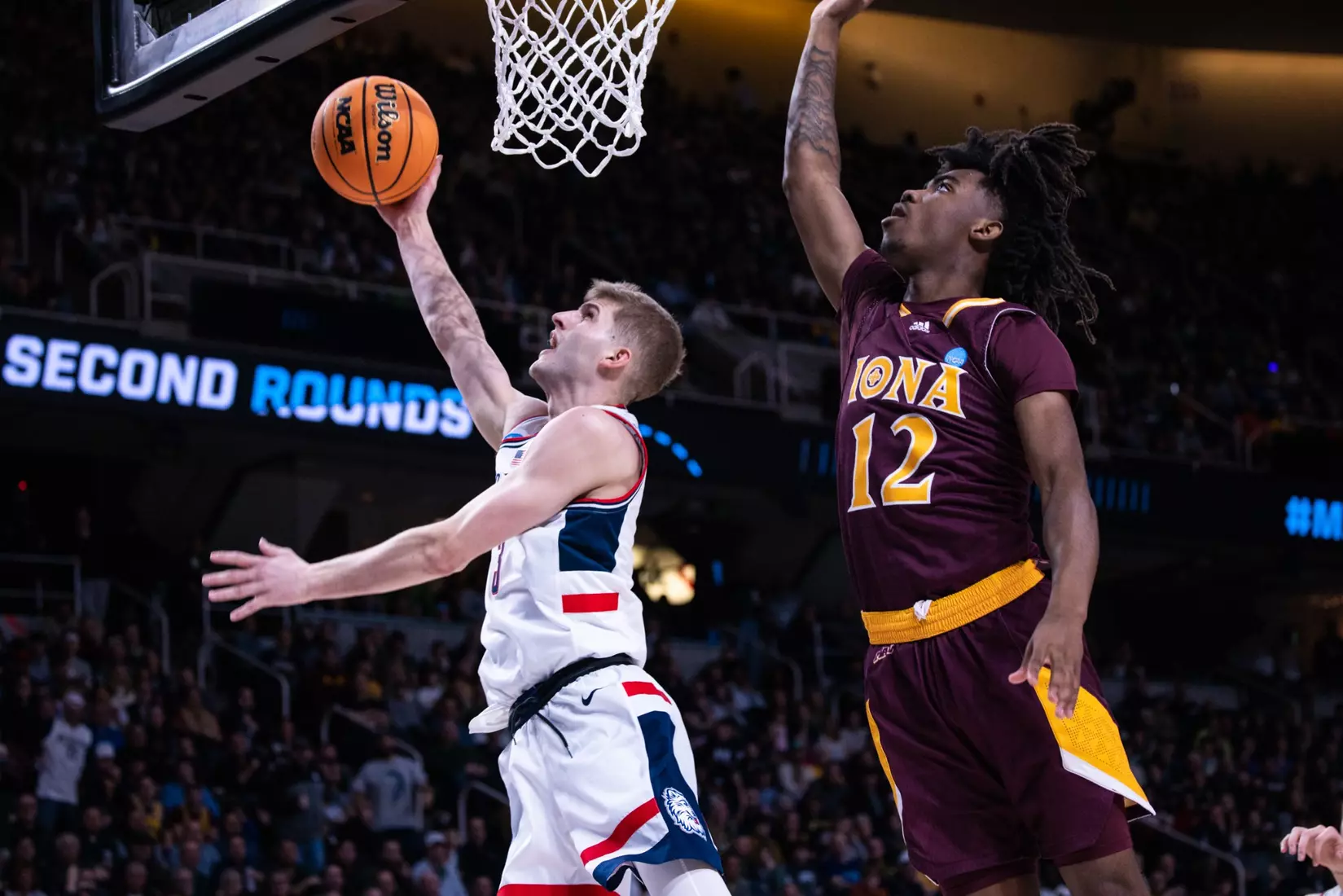 Neither team led by more than four in the first 20 minutes and Iona's 6-foot-3 Daniss Jenkins seemed to send a message in the final minute when he came swooping in for an emphatic block on the 7-2 Donovan Clingan to keep the Gaels in front, 39-37 at the break.